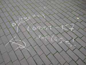 “Oligarch, Salon-Bolschewist”, ruft er ihm entgegen, nachdem der “Antifaschist” dem Maoisten der KPD, denn als dieser versteht sich der Goetheanist Kigan Thorix in der ‘Dingwelt der Objektivisten’, vorwirft, das Ansehen der “Linken” (ha, ha) mit seiner Demonstration zu beschädigen! Nein, eine “Linke”, die fest zum Klerus der Oligarchie steht, die zu einem Teil des rassistischen Unterdrückungsapparates geworden ist und damit das lebendige und transzendentale ‘Volk’ der Titaniden ‘Aphrodite’, ‘Gaia’ und‘Themis’ verrät, hat sich in eine neonazistische Gruppe verwandelt, in Paramilitärs einer “Totenkopfbrigade”, in Wächer-innen eines ‘Vernichtungslagers’. Deshalb schreibt die rotgardistische Instanz des Ganzen auch folgenden Text mehrfach für alle Individualitäten sichtbar auf die roten Steine: “Gaia-Essen. Corona-KZ auflösen. KPD (Maoisten).”