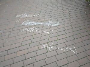 OK, er beeilt sich die ‘antievolutionären Dämonen’, aber auch die avantgardistischen durch einen Text in Kreide herbeizurufen, den er wie gewohnt auf der ‘AGORA’, dem großen Platz am Rüttenscheider Stern, und entlang der Rüttenscheider Straße Richtung Bredeney auf den Bürgersteig schreibt. Er nimmt sein grundgesetzlich geschütztes Recht zum Widerstand, zur Wissenschaft und Kunst in Wort und Tat wahr, wie es die Göttin ‘Athene’ fordert, auch wenn es anderen Machtusurpatoren aus dem “tiefen Staat” nicht gefällt! Ein untoter Dämon nämlich, ein Sozialfaschist, der wohl derselbe ist, der dem Poesieberater vor längerer Zeit mit einer älteren Frau das Kunstwerk in Plakatform in einem Handgemenge stahl, das jener bei seinem damaligen ‘Künstler-Interview’ verwendete, handelt jetzt nicht nur kulturvandalistisch, indem er den gerade aufgebrachten Schriftzug mit dem Fuß unleserlich macht, sondern versucht den ‘Botschafter aus Neu-Weimar’ auch körperlich zu attakieren, was dieser allerdings mit Nachdruck verhindert.